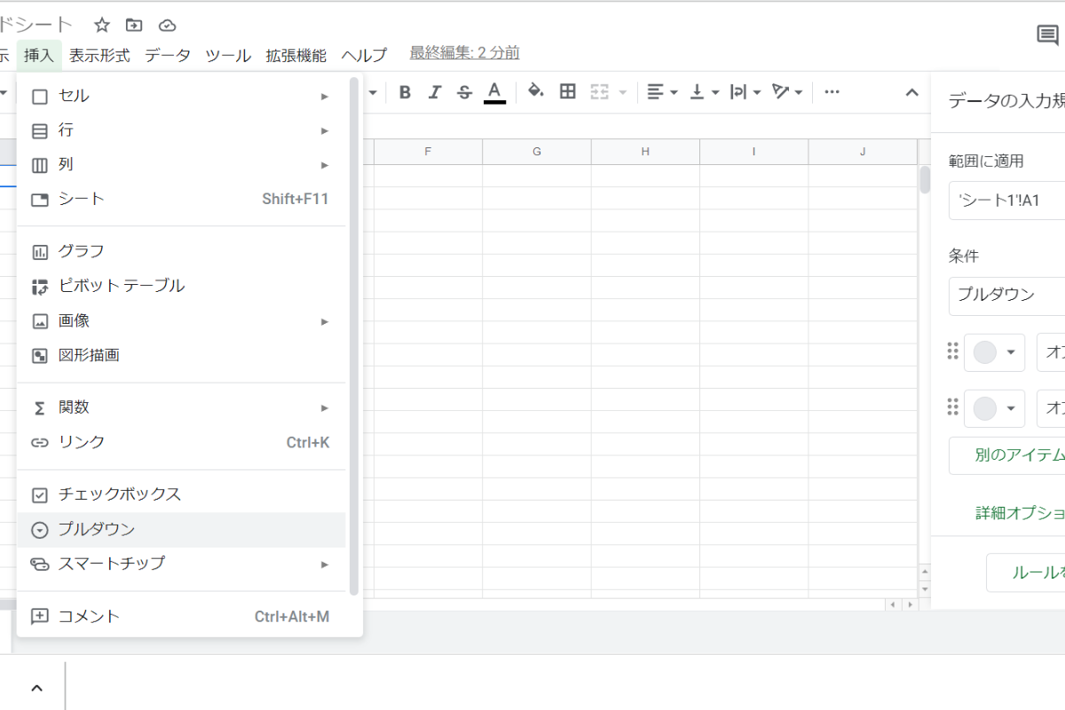 これまでは、データの入力規則からのみ作成可能でしたが、挿入からプルダウンを選択できるようになり、色分けなどの機能も追加されました。