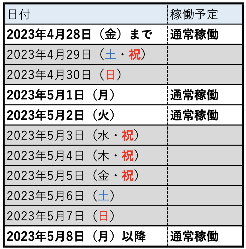 2023年度ゴールデンウィーク期間はカレンダー通り通常稼働いたします。