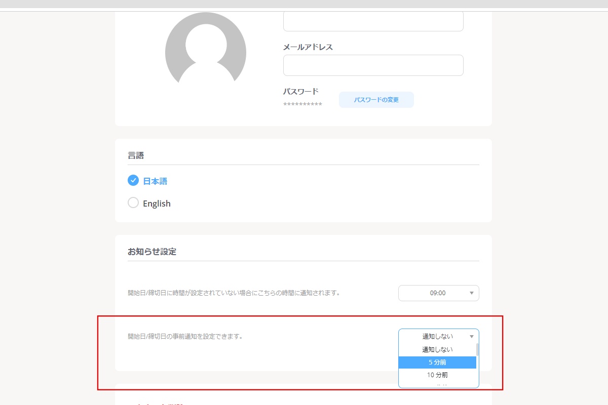 リマインダー設定はマイアカウントのお知らせ設定からおこないます。