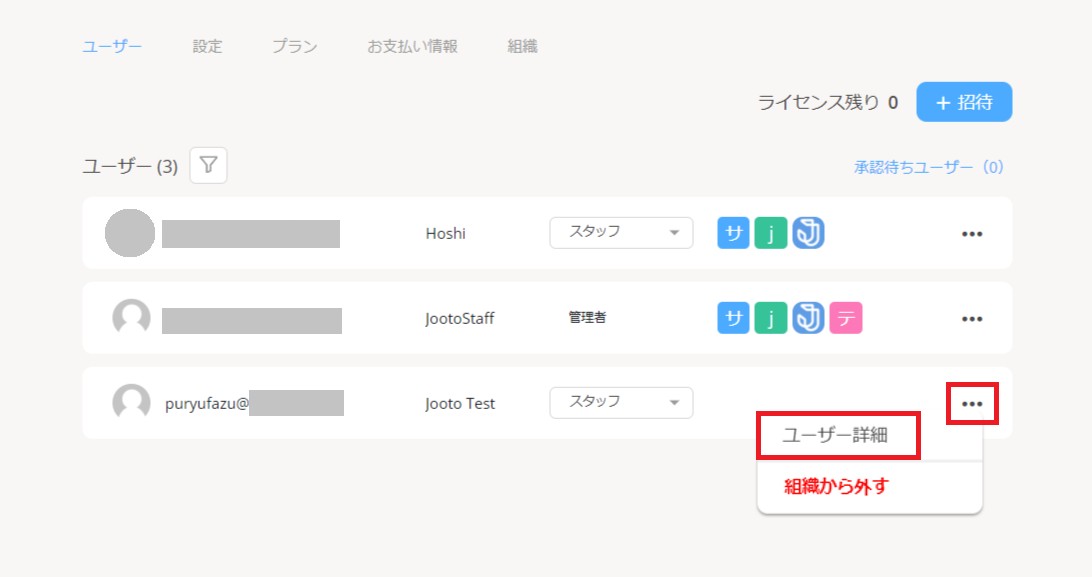 ユーザーの参加が完了したら、管理者がそのユーザーの右側にあるメニューボタンからユーザー詳細をクリックします。
