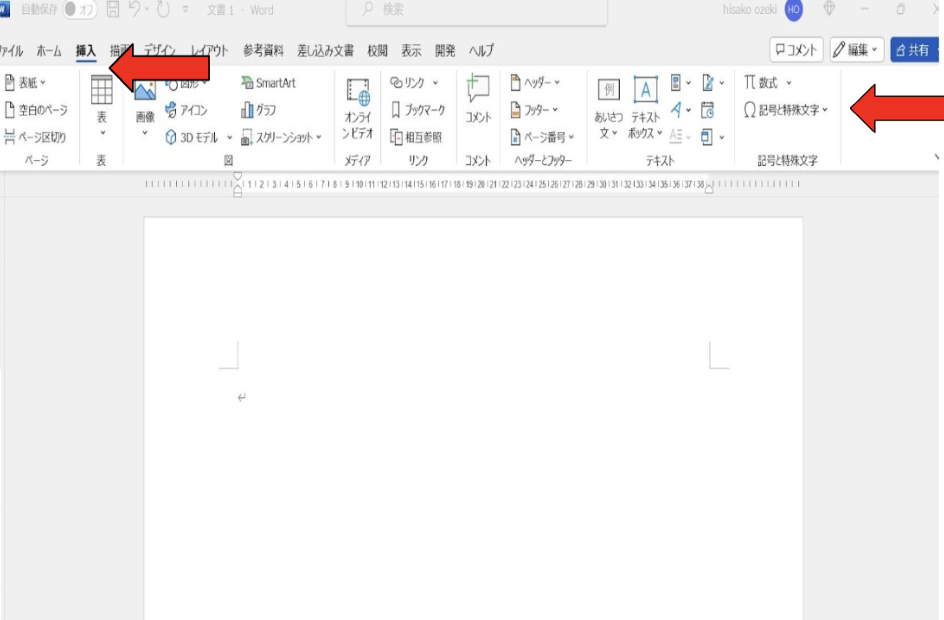 1. 「挿入」→「記号と特殊文字」をクリックする