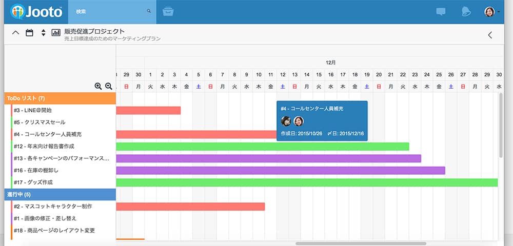 タスクの開始日・締切日・担当者、そして各種タスクの進行状況をざっと俯瞰して見ることが出来るものです。ソート(並びかえ)機能も併用してご自分の見やすいようにビューを変えながらご活用ください。タスクの工程管理してるユーザーさま方にとってはとても便利なツールです。