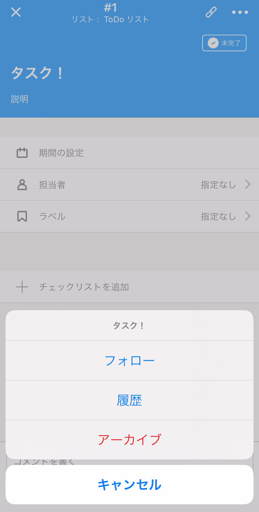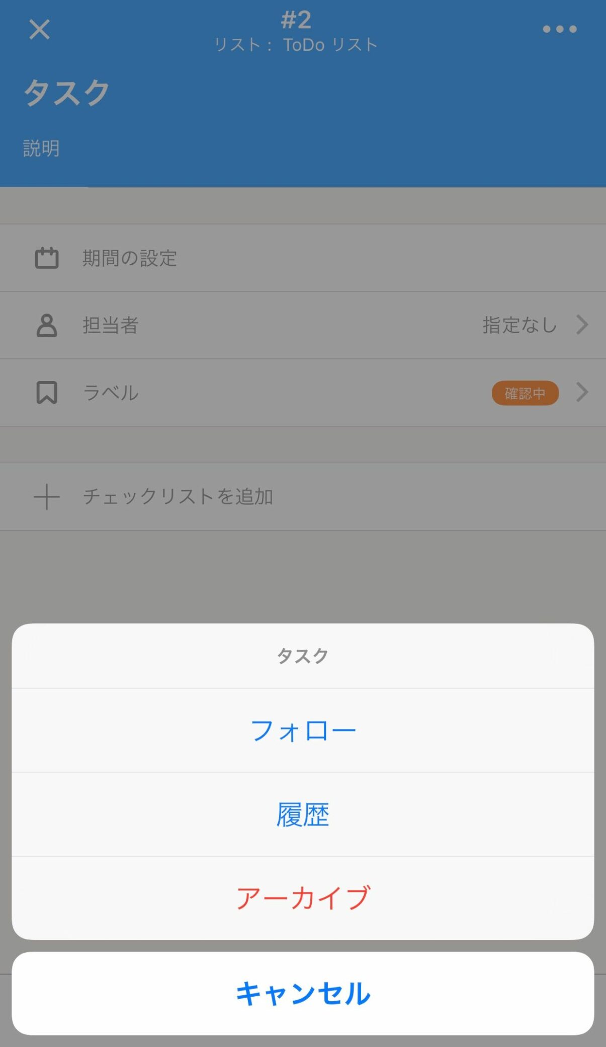 - アーカイブ: プロジェクトボードから非表示にできます。タスクの削除をしたい際は、一度アーカイブし、その後削除することで完全に削除することができます。