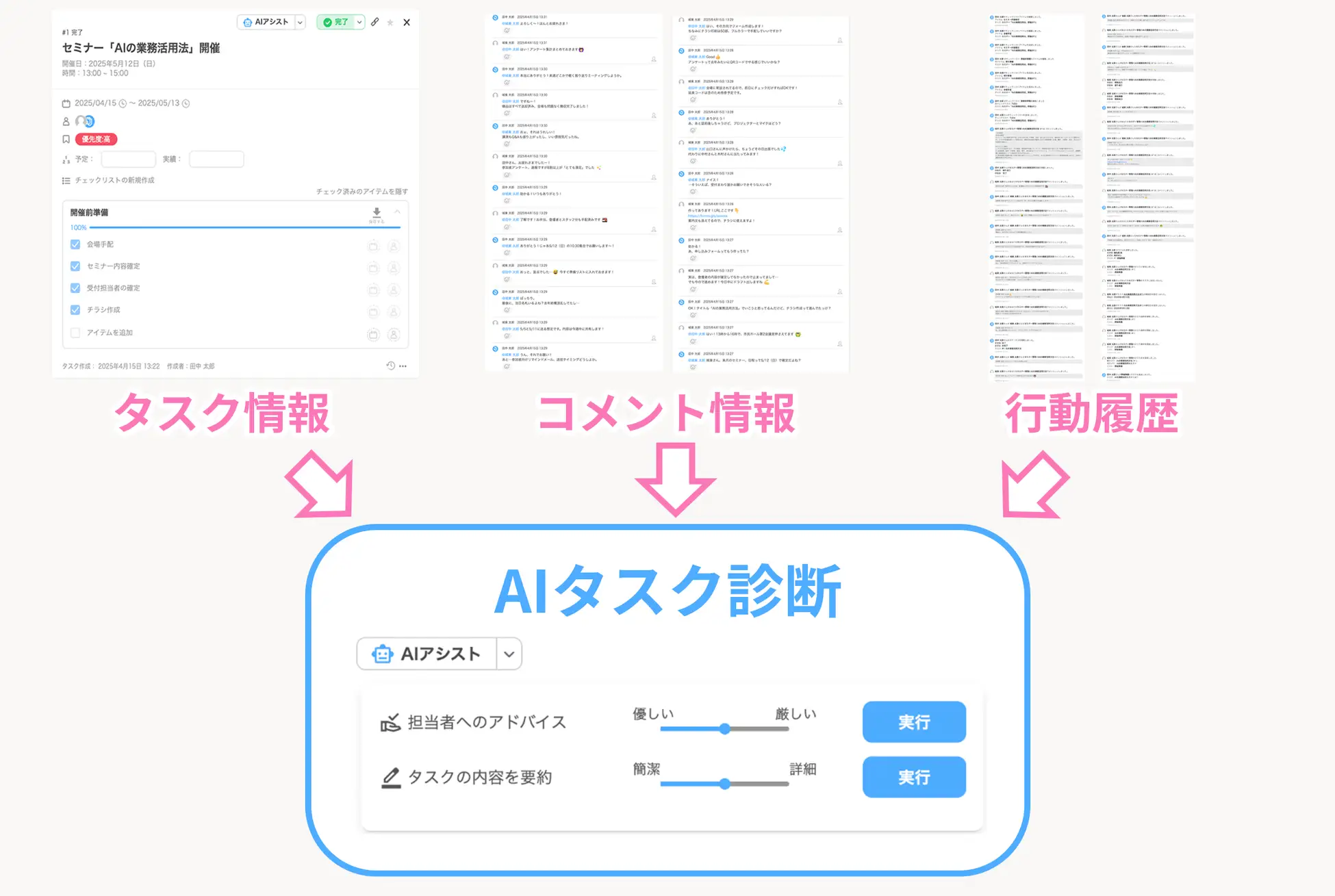 Jootoで管理されるタスクには、日々の業務に紐づく進捗・会話・成果の記録が積み重ねられ、個人やチームの資産であると私たちは捉えています。これをAIが分析して次の仕事をより良くするためのヒントを提供するのが、「AIタスク診断機能」です。本機能には、「AIタスク要約機能」と「AIタスクフィードバック機能」の2つがあり、診断したいタスクに関連する全ての情報を元にAIが分析を行います。