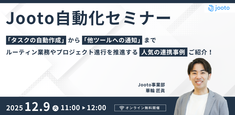 本セミナーでは、Jootoの「自動化機能(API連携)」を活用し、そんなルーティン業務の手間や、ヒヤッとする瞬間を削減する具体的な解決策をご紹介します。