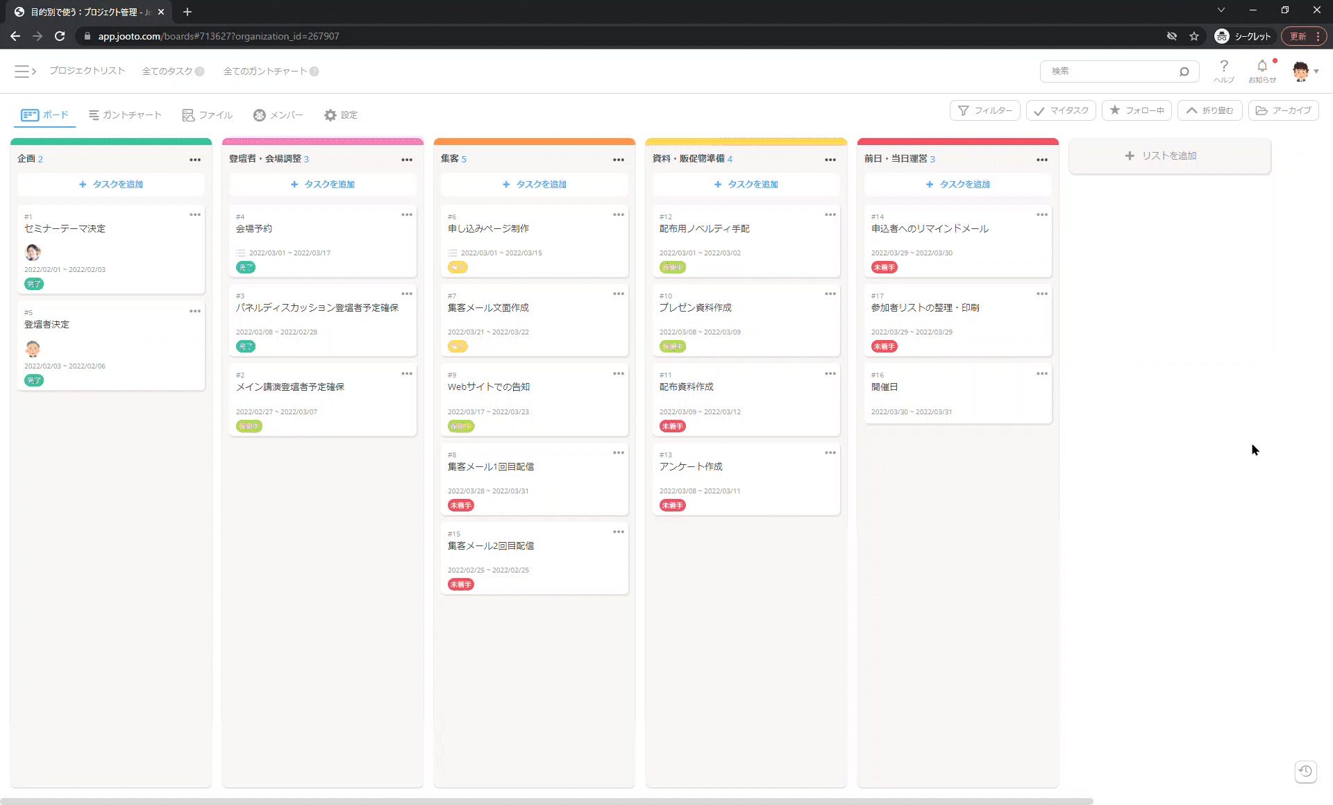 これまで締切日(期限)を確認できる機能としては「全てのタスク」がございましたが、締切日を過ぎたタスクを確認したいという場合やボード上で特定の期間のタスクのみを確認したいといった場合、確認が難しい状況でした。