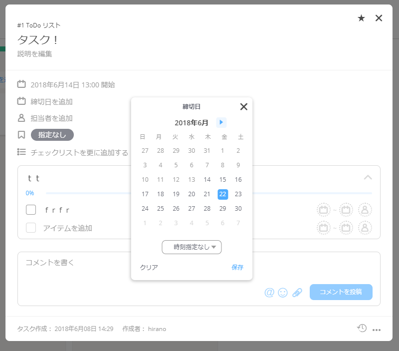 タスクごとに締切日時の設定・取り消しをすることができます。 Googleカレンダーと連携するためには開始日と締切日ともに設定することが必要です。■ 締切日の設定